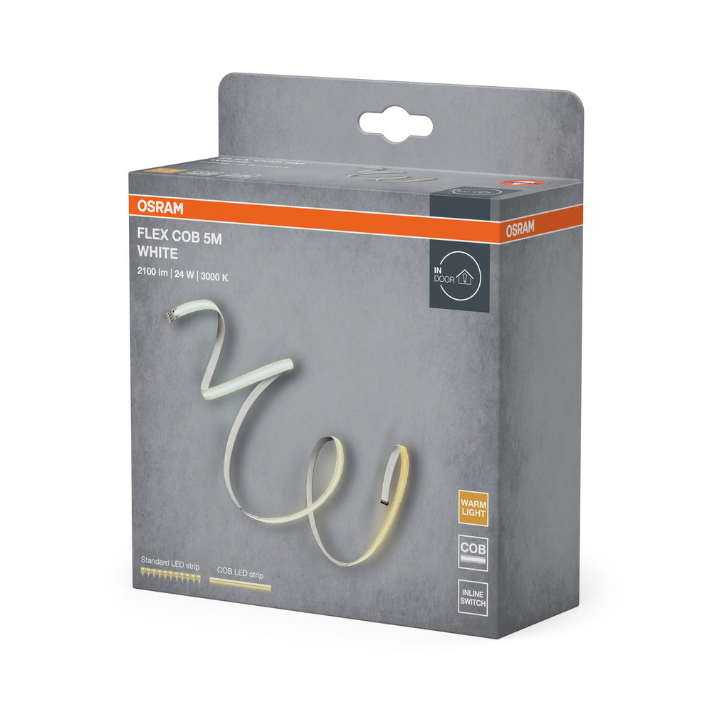 Der OSRAM FLEX COB 5M LED-Streifen bietet warme, indirekte Beleuchtung, die sich flexibel an deine Wohnräume anpasst. Damit bekommst du eine gleichmäßige Lichtwirkung ohne sichtbare Punkte und eine einfache Installation – ideal für gemütliche Akzentbeleuchtung.