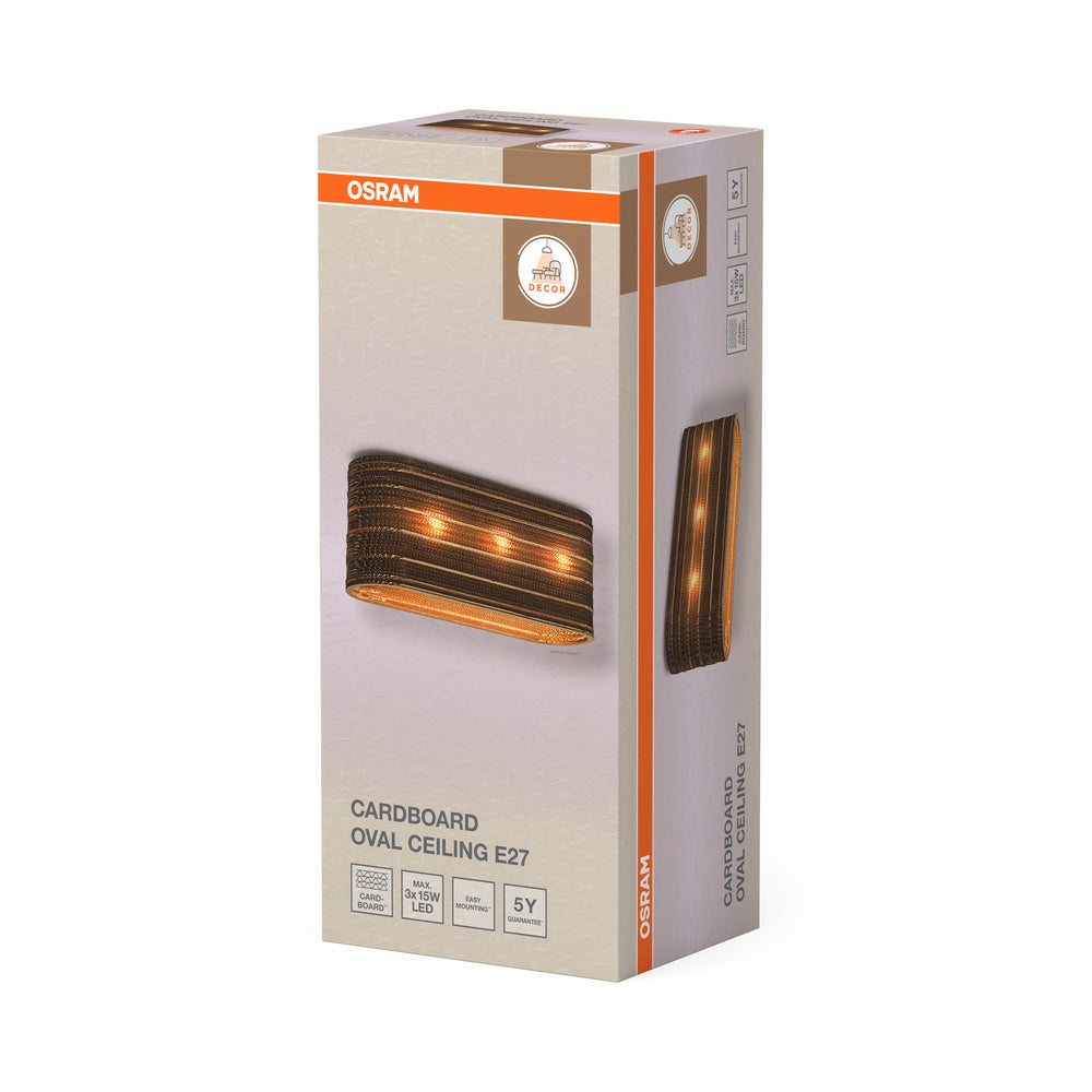 Die OSRAM DECOR Cardboard Oval Deckenleuchte braun verbindet dekoratives Design mit nachhaltigen Materialien. Sie eignet sich ideal für Innenräume wie Flure, Eingänge, Treppenhäuser, Wohnzimmer oder Keller – und sorgt für eine warme, einladende Lichtstimmung.