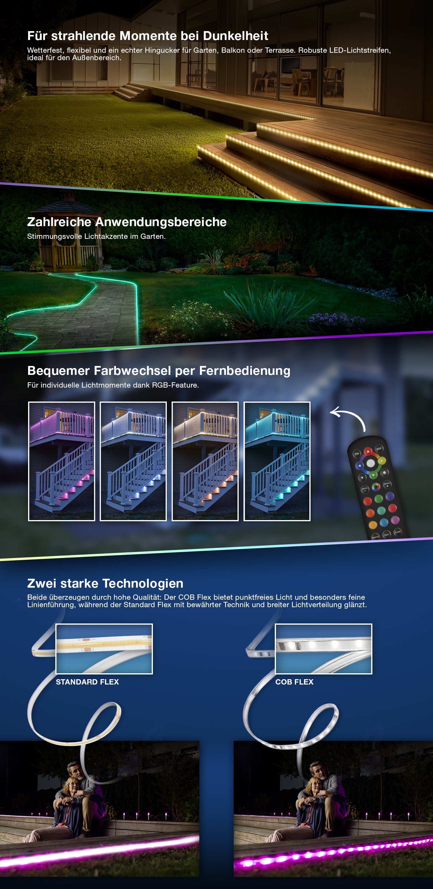 Dekorative LED-Streifen für den Außenbereich mit homogener Lichtwirkung, IP44. Produkteigenschaften: COB Technologie für homogene Lichtverteilung. Lichtfarbe: Warm Weiß. Flexible, biegsame LED-Lichtstreifen. Schutzart: IP44. Produktvorteile: Einfache und schnelle Installation. Homogene Lichtverteilung. Gleichmäßige Lichtverteilung dank COB LED. Anwendungsgebiete: Anwendungen im Außenbereich. Indirekte Beleuchtung. Technische Ausstattung: Vollständiges Montage- und Anschlusszubehör enthalten.