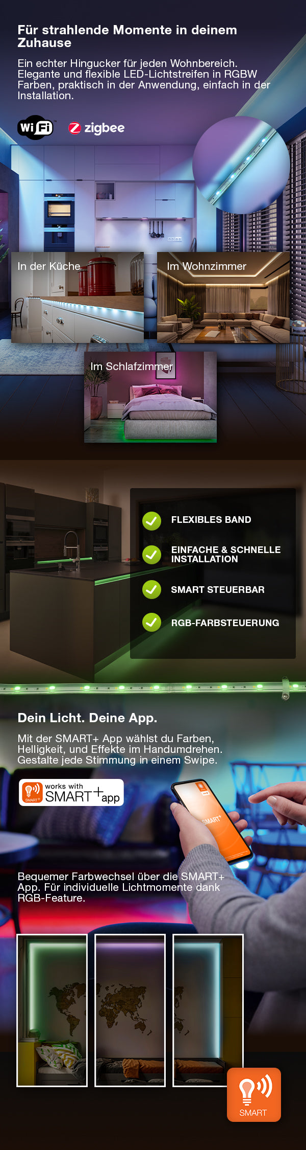 Flexible LED-Leuchtbänder für Innenraum mit Zigbee-Technologie.