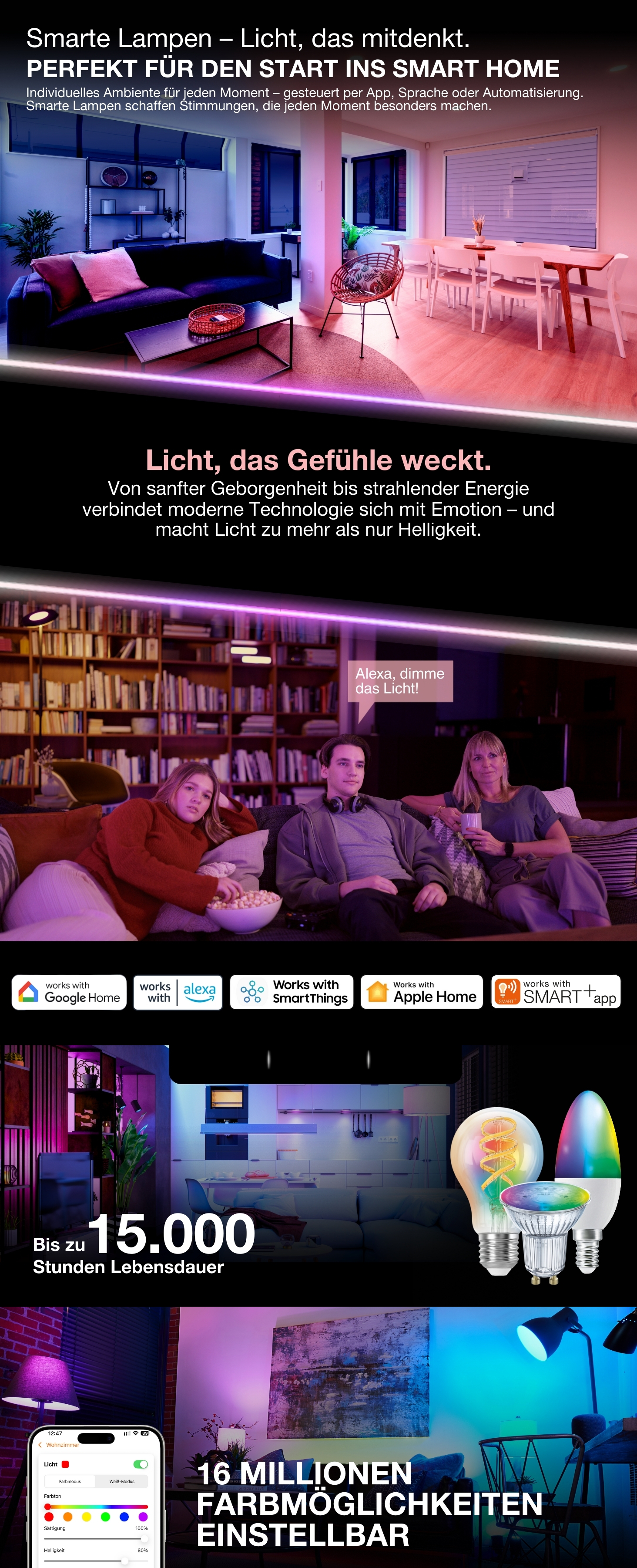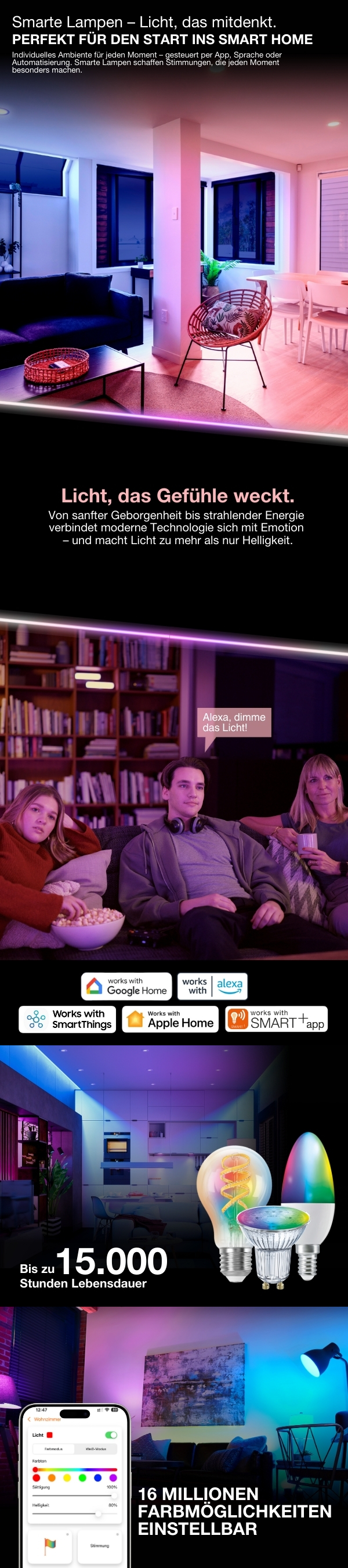 Über WLAN steuerbar und kompatibel mit dem Amazon Sprachassistenten sowie dem Google Smart Speaker, ermöglicht dir die SMART+ MATTER Filament Multicolor Classic von OSRAM eine bequeme Steuerung per Sprachbefehl oder SMART+ App. Außerdem kann man dank der integrierten Dimmfunktion die Helligkeit über SmartSpeaker oder SMART+ App individuell einstellen und so immer die perfekte Lichtstimmung erzeugen.