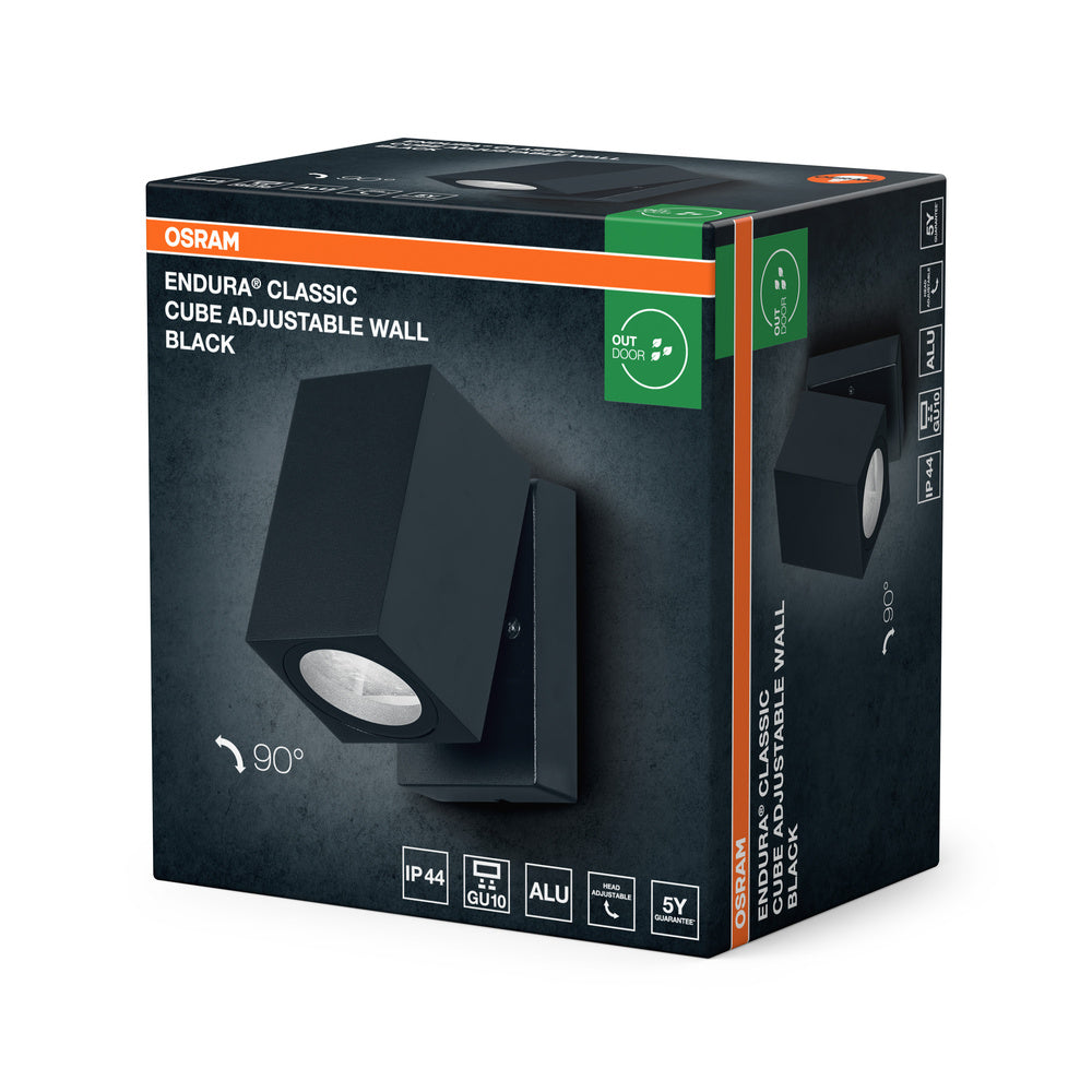 Endura Classic Cube para exterior con casquillo GU10. Características: Carcasa de aluminio fundido a presión. Cabezal ajustable. Ventajas: Gran flexibilidad en la selección de bombillas gracias al casquillo GU10. Ideal para hogares inteligentes gracias a su compatibilidad con las lámparas OSRAM Smart+. Instalación rápida y sencilla. Materiales de alta calidad. Ámbitos de aplicación: Iluminación de entradas, patios y balcones. Iluminación de fachadas. Equipamiento técnico: Incluye todos los accesorios de montaje y conexión. Bombilla no incluida.