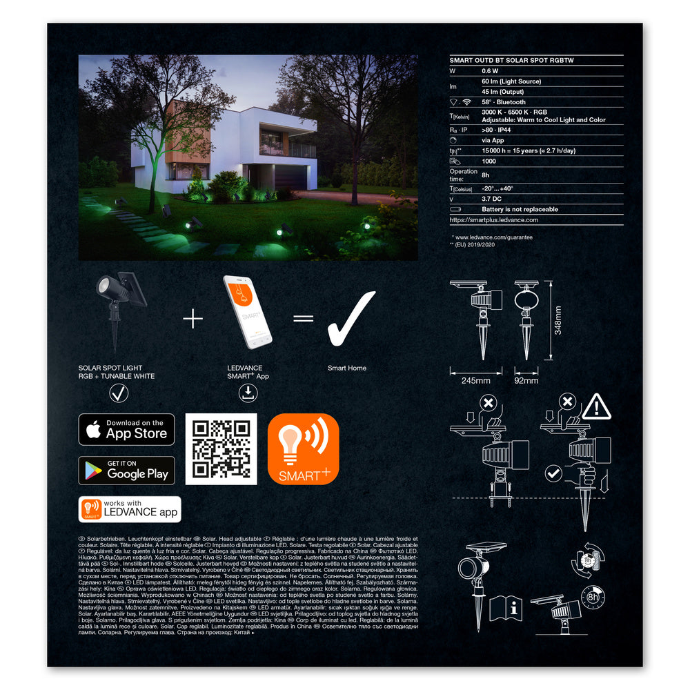 Outdoor Smart Solar Spot & Wegeleuchte. Produkteigenschaften: Steuerbar über SMART+ App (mit mindestens Android™️ 6.0 oder iOS 14.0). Solarbetriebene LED-Außenleuchten. RGB-Farbsteuerung, ca. 16 Mio. Farbmöglichkeiten einstellbar. Dimmbar. Batterieaufladung mittels Solarzelle. Netzwerkprotokoll: Bluetooth. Schutzart: IP44. Produktvorteile: Einfache und schnelle Installation. Farbenreiche Gartenbeleuchtung mit smarten Steuerungsmöglichkeiten. Bedarfsgerechte Beleuchtung und Energieeinsparung mittels Tageslichtsensor. Hochwertige Materialien. Flexibel montierbar, auch ohne Verwendung von Erdspießen. Anwendungsgebiete: Außenanwendung (IP44). Gärten. Terrassen, Balkone. Technische Ausstattung: Für die Steuerung über SMART+ App ist ein Smartphone oder Tablet erforderlich.