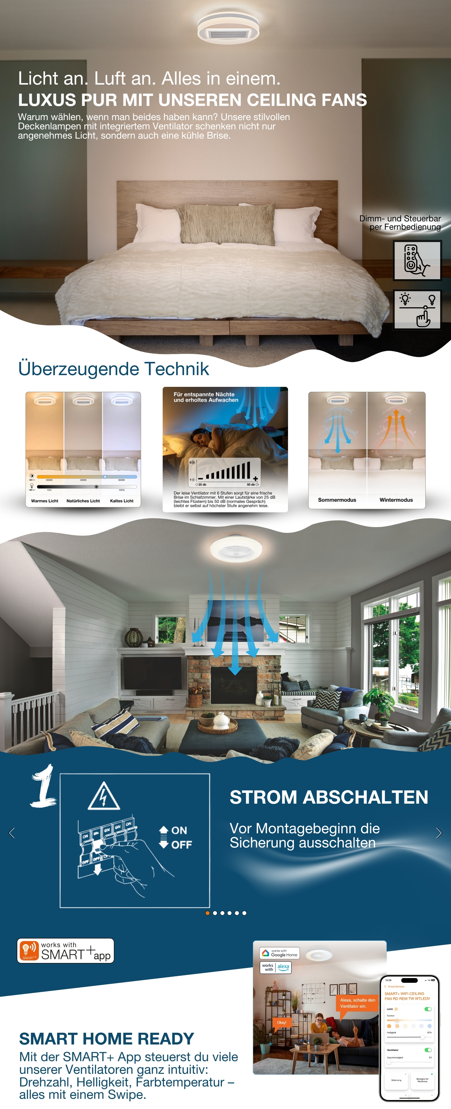 Ventiladores de techo inteligentes con Wi-Fi para diversas aplicaciones, que combinan luz y ventilación. Características del producto: Protocolo de red: Wi-Fi. Luminaria con función de ventilación integrada. Velocidad de aire ajustable. Control de temperatura de color y color RGB mediante Smart Control. Controlable mediante la app SMART+. (con al menos Android™ 4.4 o iOS 14.0). Incluye control remoto para un funcionamiento independiente de la red. Ventajas del producto: Diseño elegante, compatible con diversos estilos de decoración. Fácil instalación. Ámbitos de aplicación: Cocina, salón, habitación infantil u oficina. Solo para iluminación interior. Características técnicas: Incluye todos los accesorios de montaje y conexión. El control por app o voz requiere un sistema de domótica compatible. Para control mediante SMART+. Se requiere un teléfono inteligente o tableta para usar la aplicación. Incluye control remoto.