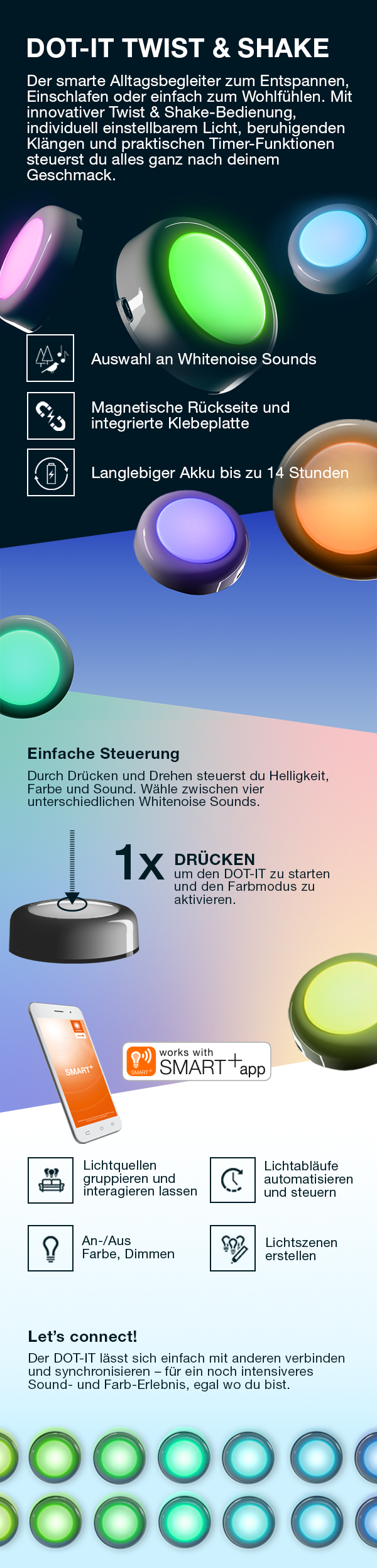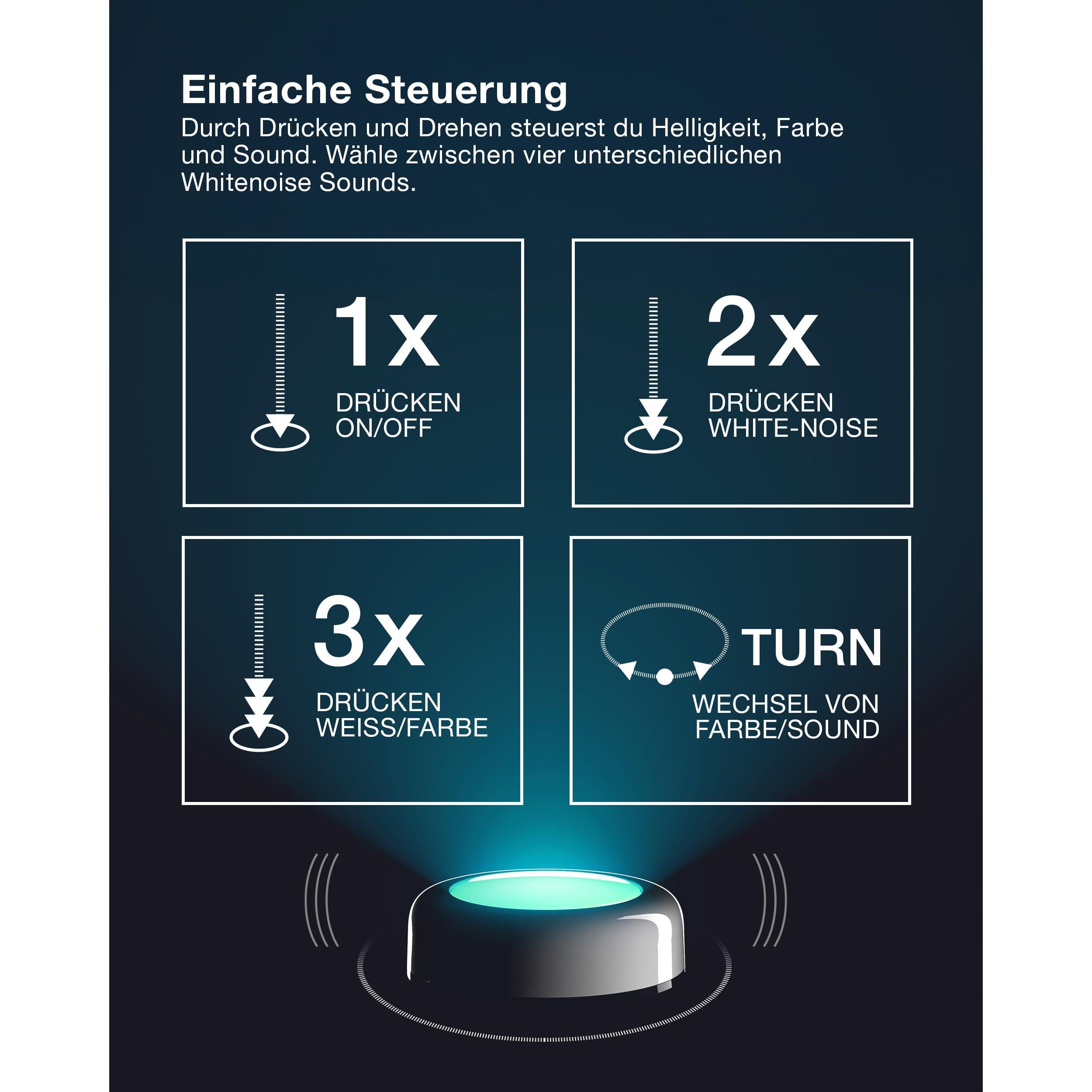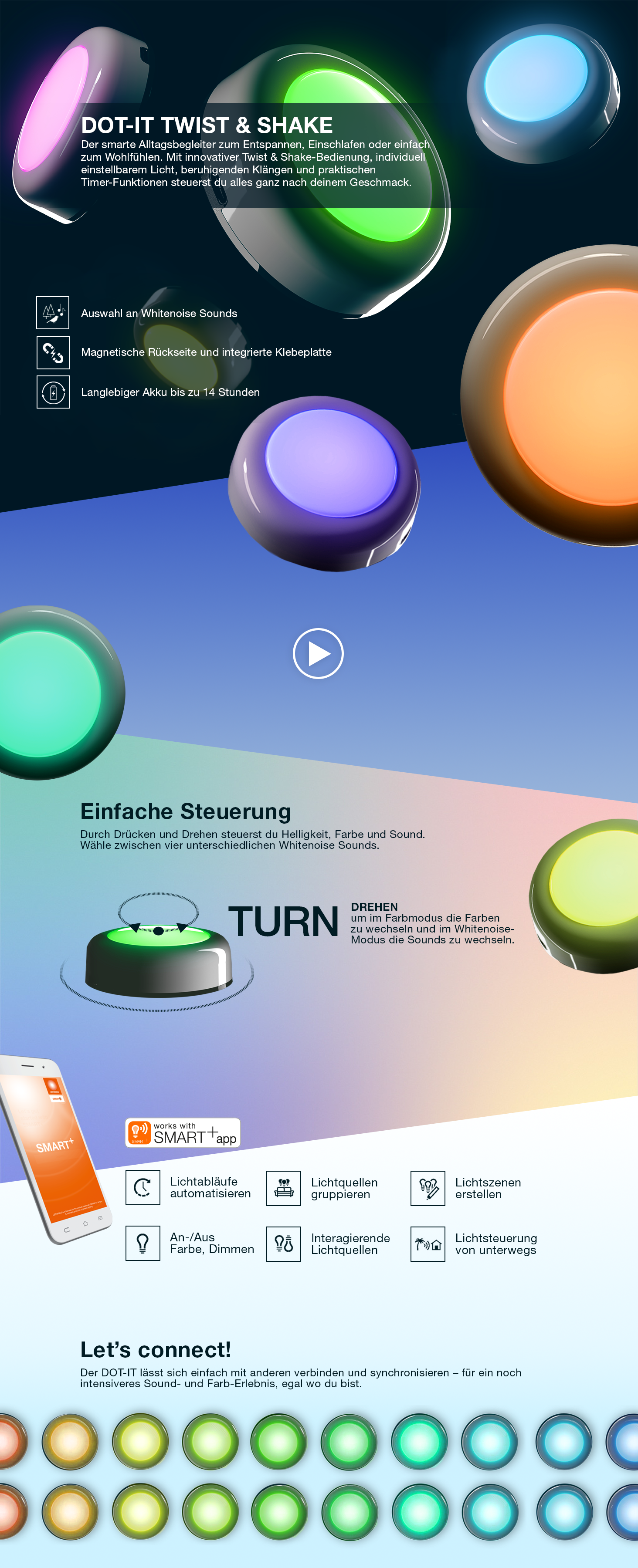 La OSRAM DOT-IT TWIST & SHAKE es una fuente de luz compacta y recargable con función de ruido blanco integrada, ideal para noches relajantes, rituales para dormir y una iluminación ambiental en cualquier habitación. El práctico pack de 3 incluye tres luces idénticas que se pueden usar con flexibilidad y se integran a la perfección en su hogar.