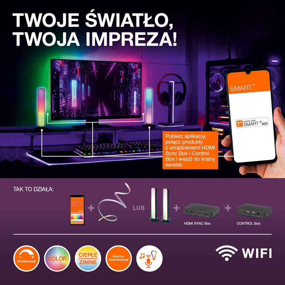 Con el Control de Color MAGIC RGB, puedes cambiar la atmósfera al instante: un blanco cálido relajante para noches de cine, colores vibrantes para fiestas o una luz fría para jugar. La conexión Wi-Fi permite controlar la aplicación, crear horarios y agrupar varias lámparas para una iluminación sincronizada en zonas enteras, ideal para iluminar habitaciones con flexibilidad sin levantarse.