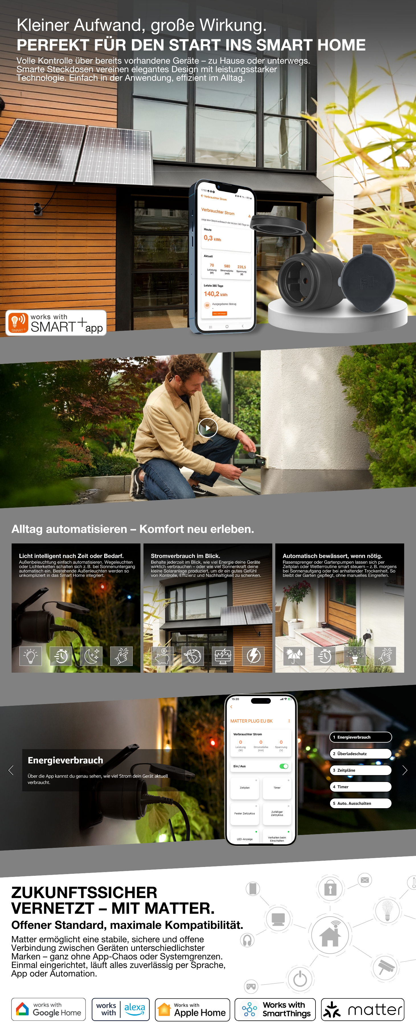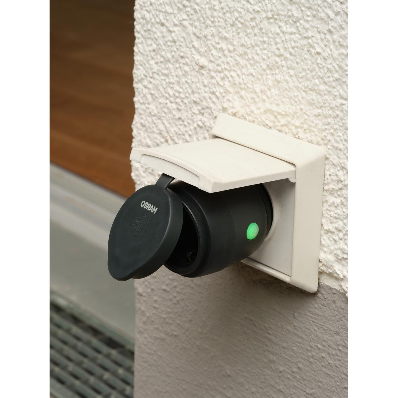 Kompakte smarte Außensteckdose mit Energieverbrauchskontrolle über ZigBee Technologie steuerbar.